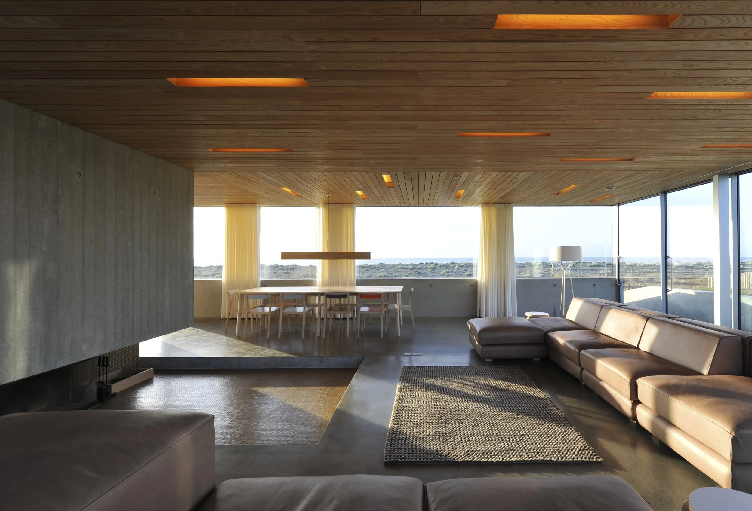This architectural ambiguity of the house also addresses the programmatic difference between the private upper floor and the social ground floor. The living area and the terraces are set into the dunes in order to protect it form the strong winds, and opens equally in all directions to allow for wide views. The corners can be opened by sliding doors; this to emphasize the floating appearance of the top floor.