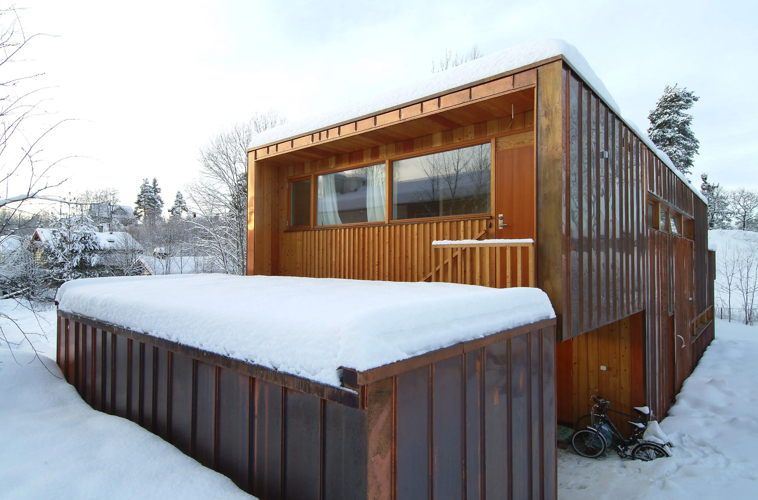 The building spans between two small hills and thus acts as a vertical end-wall of the horizontal garden-room. The wall is penetrated by access points and window openings revealing the plan towards the front garden. The simplicity of the Cartesian outer shell is contrasted by a rich and varied section, with a continuos light distribution filtering throughout the longitudinal section of the house.