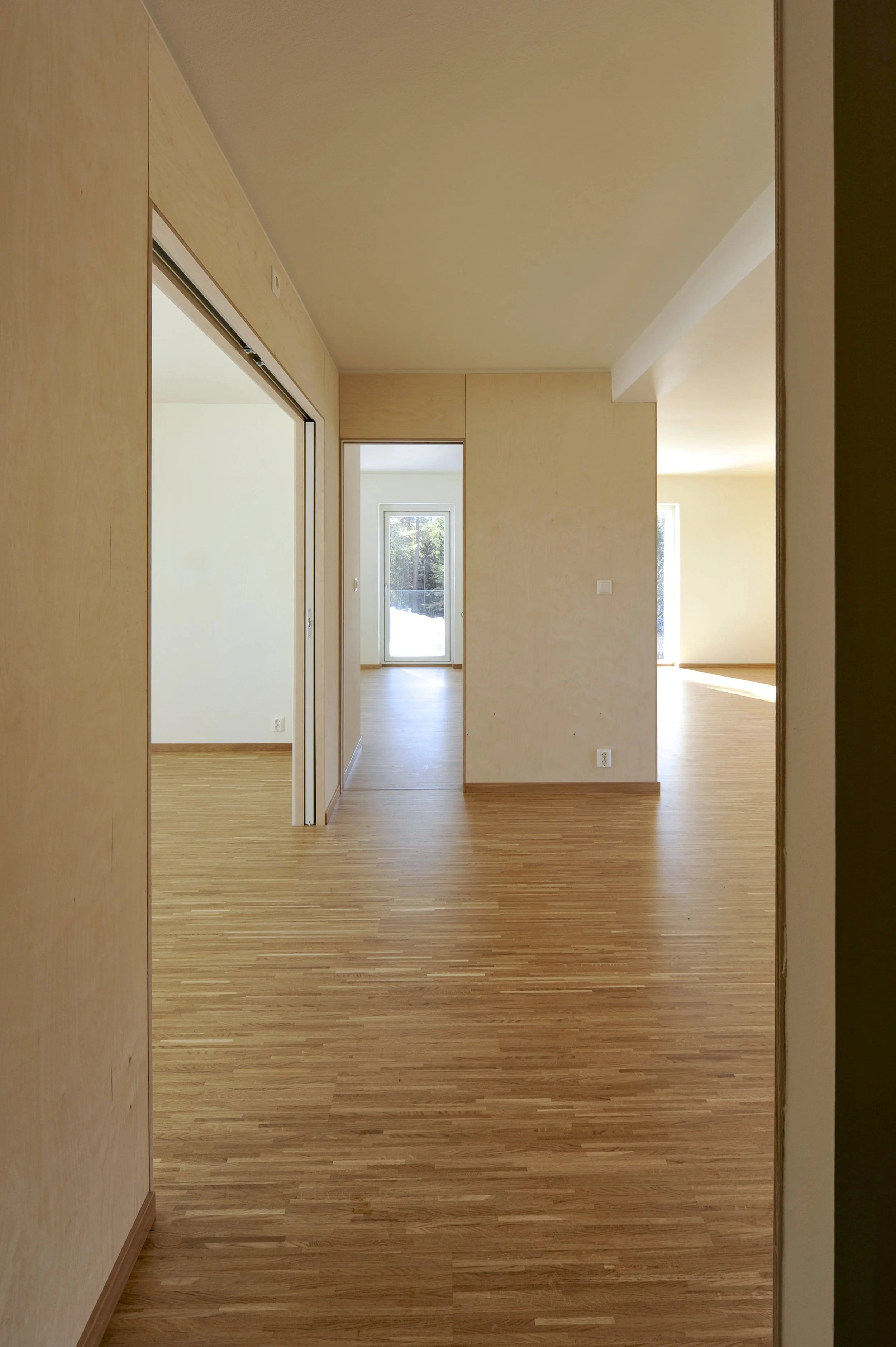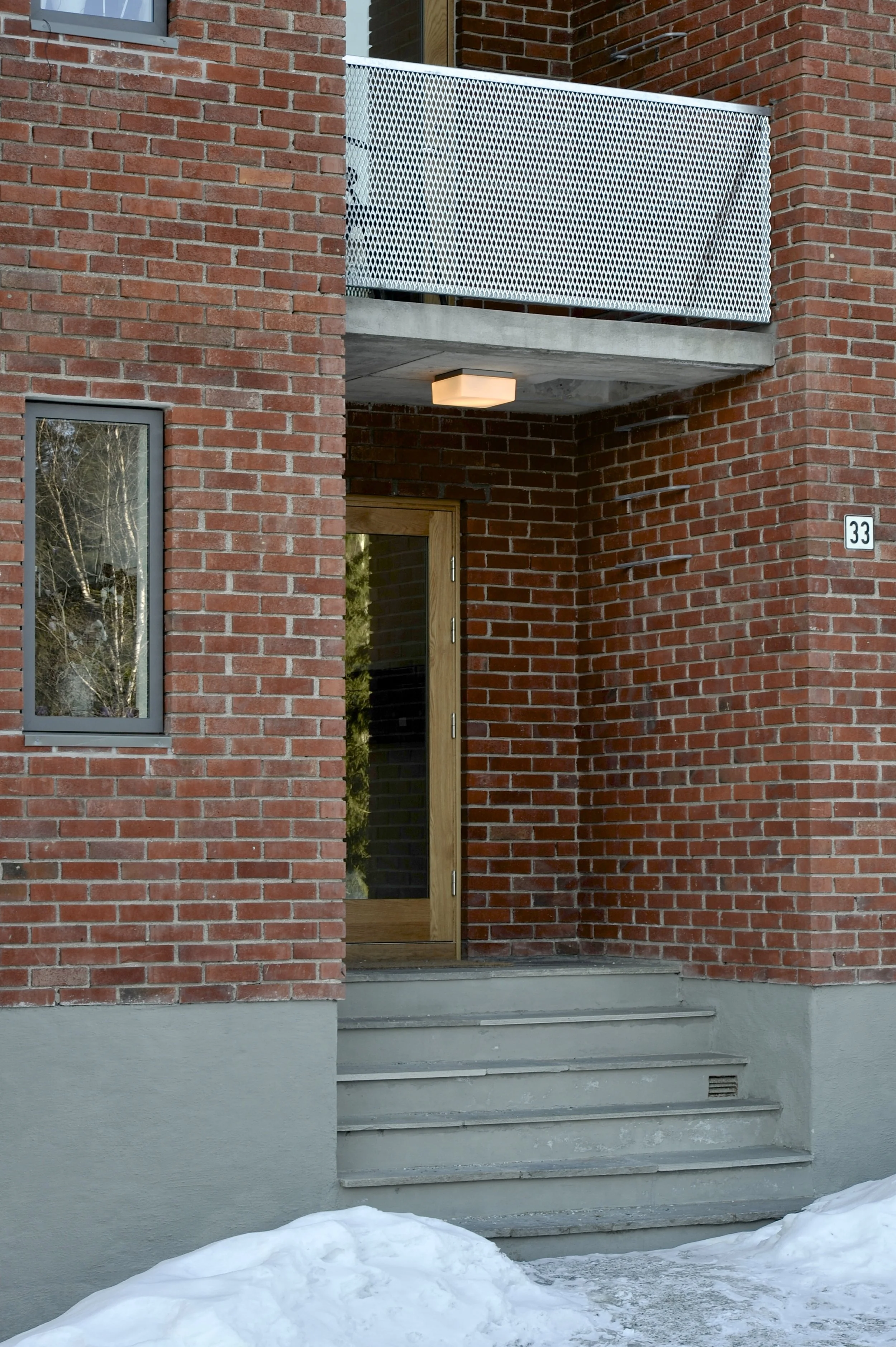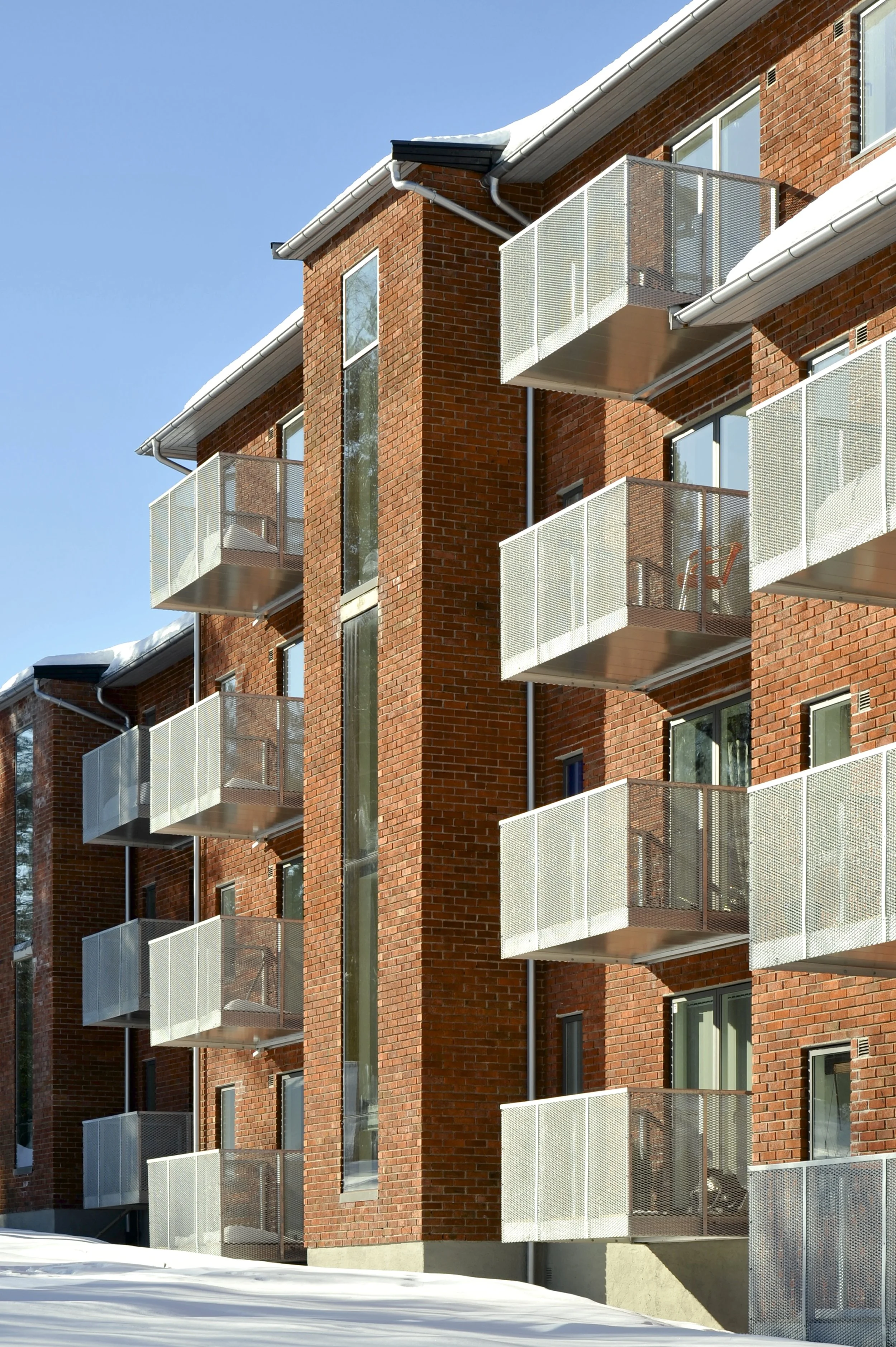 The block of small flats dates originally from the late 50’s. By doubling the size of the existing apartments, we achieved efficient two bedroom flats with natural light both from east and west. New balconies are added at both of these sides. Half of the flats have plans organized in a rectangular manner, while the other half are characterized by a looser geometry which aim at a more fluent relationship between light and the ordering of space.