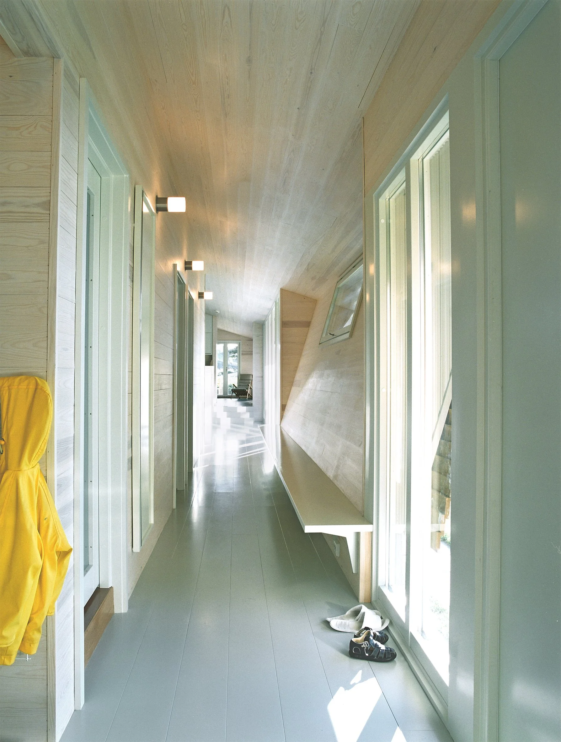 The cabin establishes a wall between the oak forest and the beach, giving a secluded garden character to the forest. The building creates a gate in the wall, to control the contact between the rooms through the most important room of the cabin. The rest of the building is kept relatively enclosed in contrast to the "gate". Windows are established through saddlebags, setbacks or by removing part of the panelling. The conceptual establishment of the wall is deliberately undermined by the section, attempting to lightness and movement.