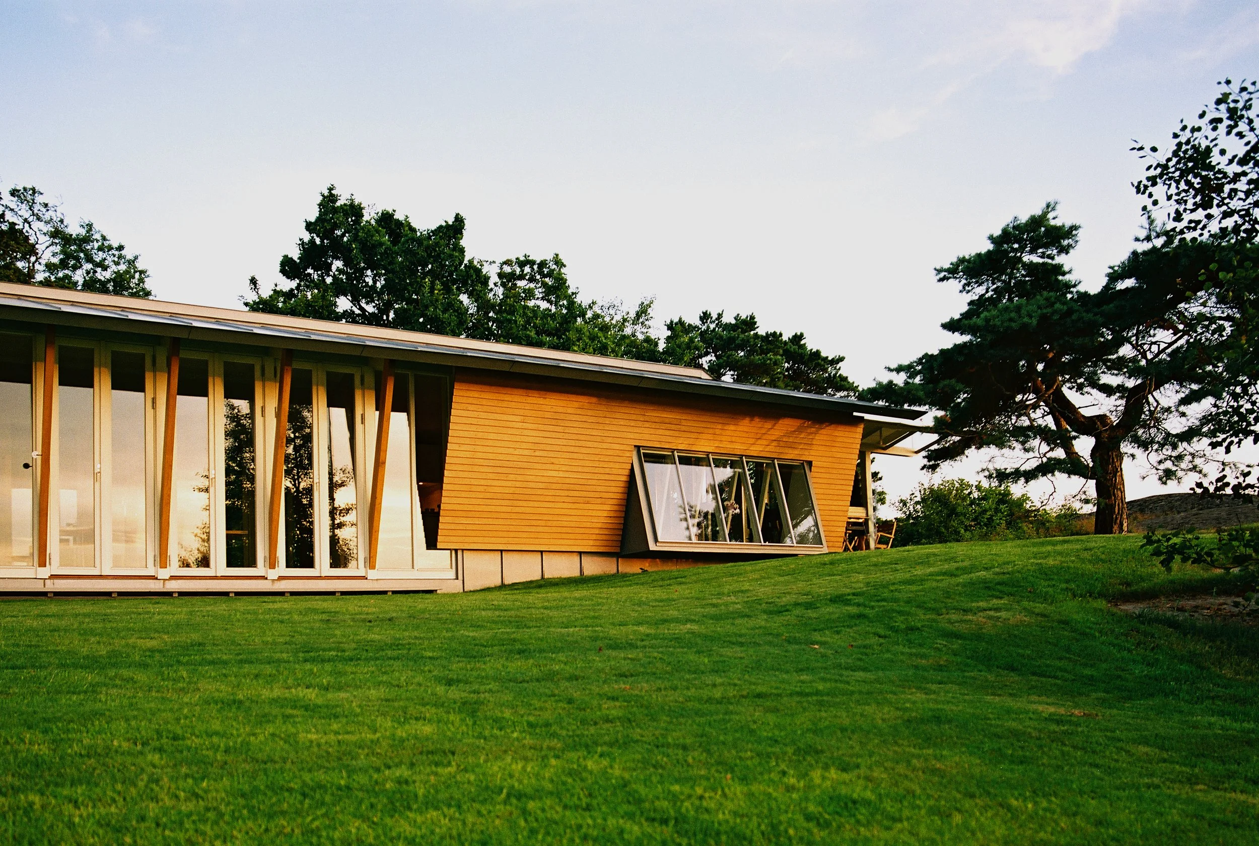 The program is structured from east to west, from sleeping through dining to the living room following the path of the sun. The facades are covered with oiled oak panelling. Roof is zinc.