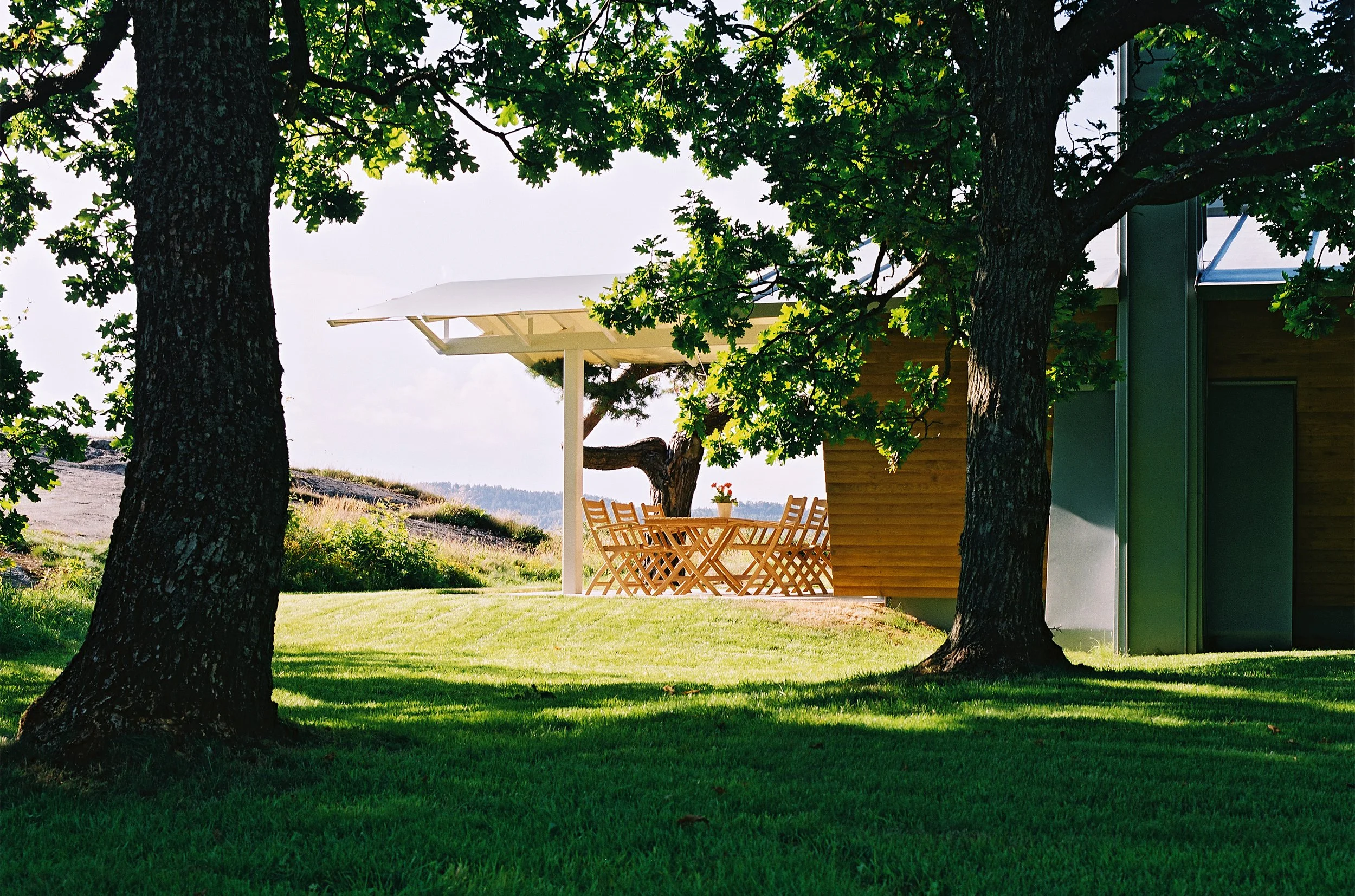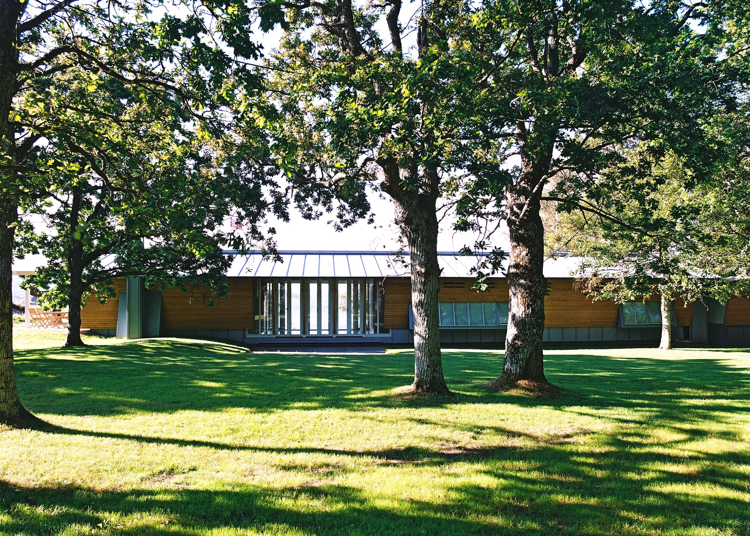 Hytta danner en vegg mellom eikeskogen og stranden, og gir skogen en skjermet hagekarakter. Bygningen skaper en port i denne veggen, som styrer forbindelsen mellom rommene gjennom hyttas viktigste rom. Resten av bygget er relativt lukket i kontrast til "porten".