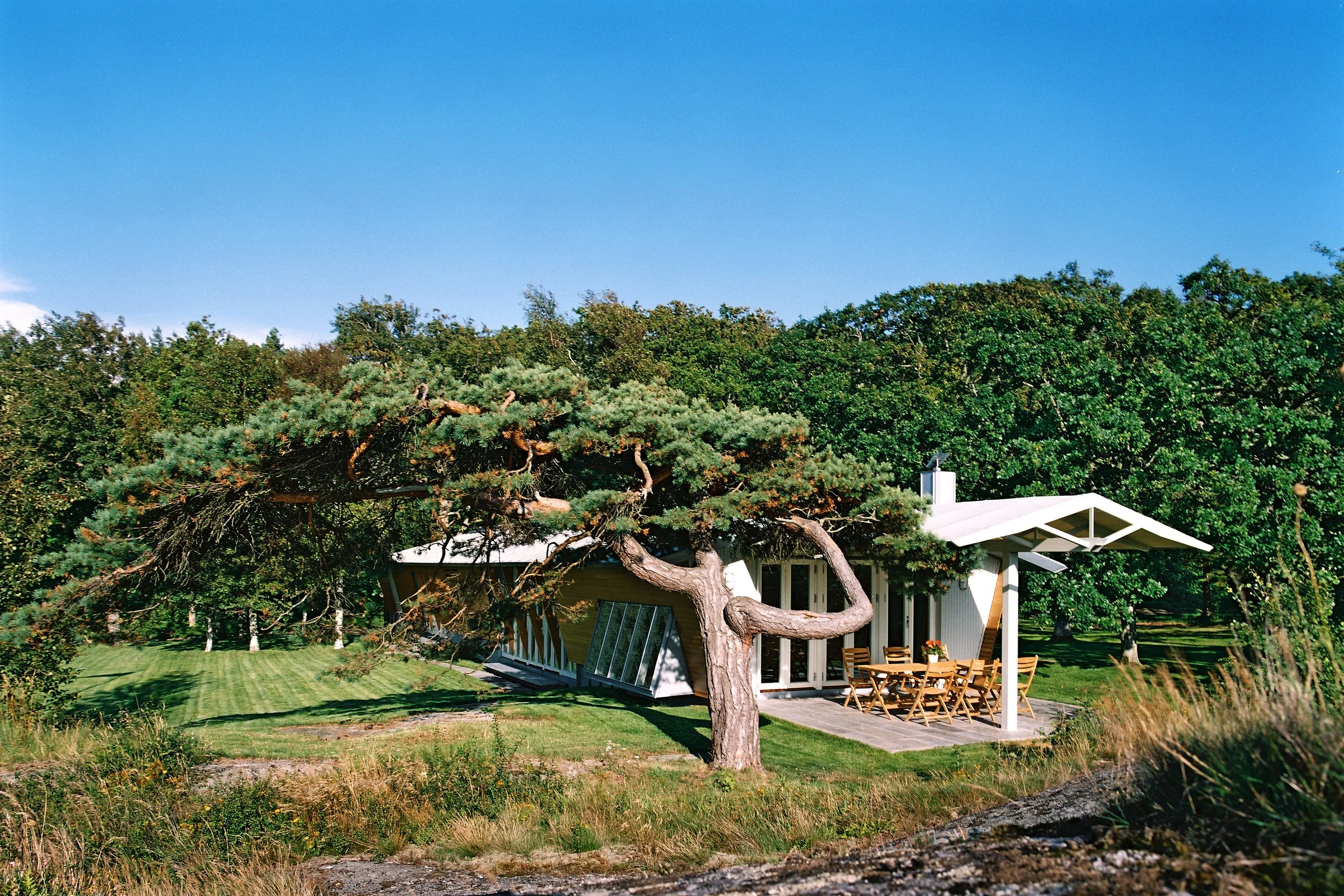 Sommerhytta ligger i et vakkert landskap ved vannet på Sørlandskysten. Det omkringliggende terrenget er så vakkert at det vanskelig lar seg forbedre gjennom bygningsmessige inngrep. Løsningen søker derfor å forsterke grensene mellom de ulike naturrommene på stedet, og tydeliggjøre både delene og overgangen mellom dem.