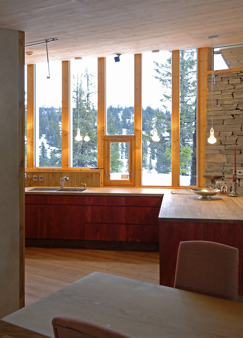 The lodge is set on a mountain shelf overlooking a valley towards the south. The place is exposed towards strong winds and snowdrift. Embracing a huge boulder, the two houses are organized around an internal courtyard, a snow garden.