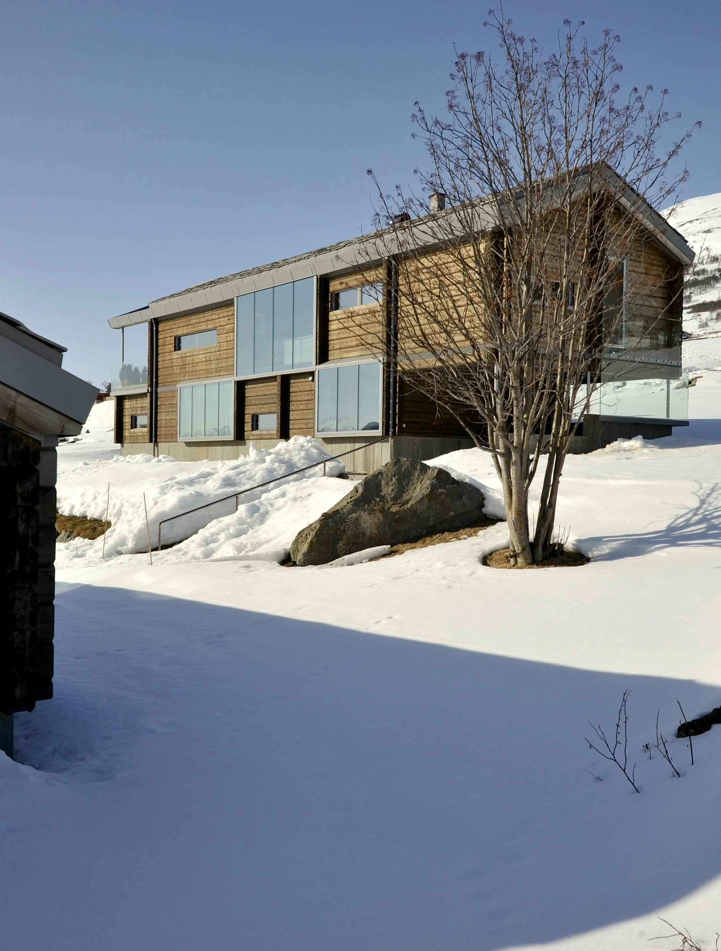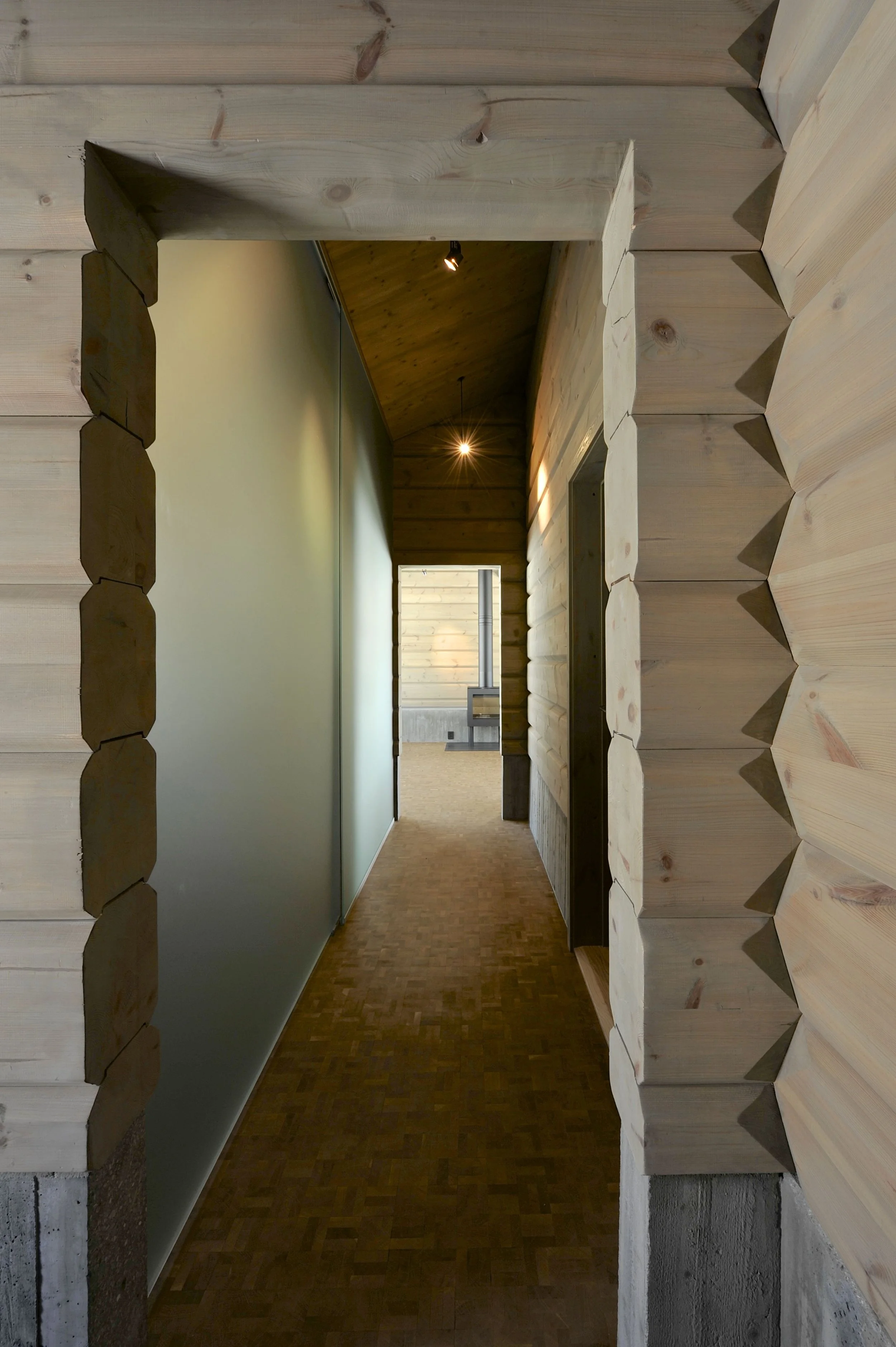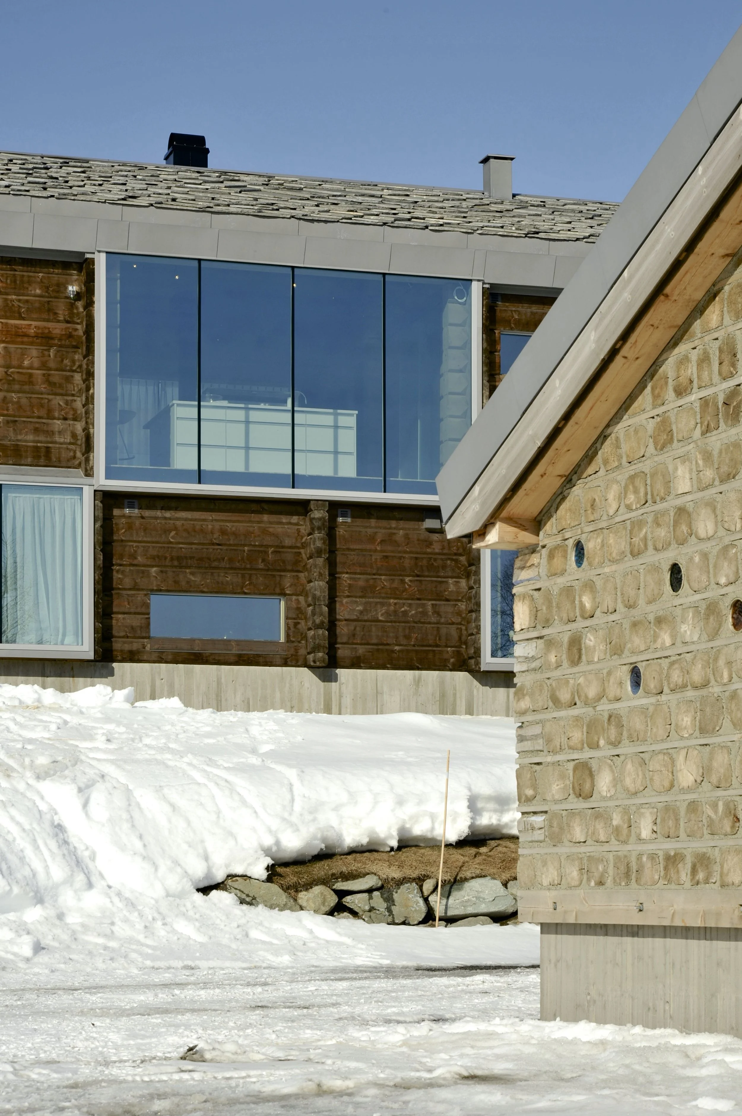 The buildings combine traditional vernacular log techniques with a modern architectonic expression. This really comes to show by using large glass surfaces mounted between the knots of the log structure. Interplay between glass-framed parts and the log structure arises – creating varied spaces.