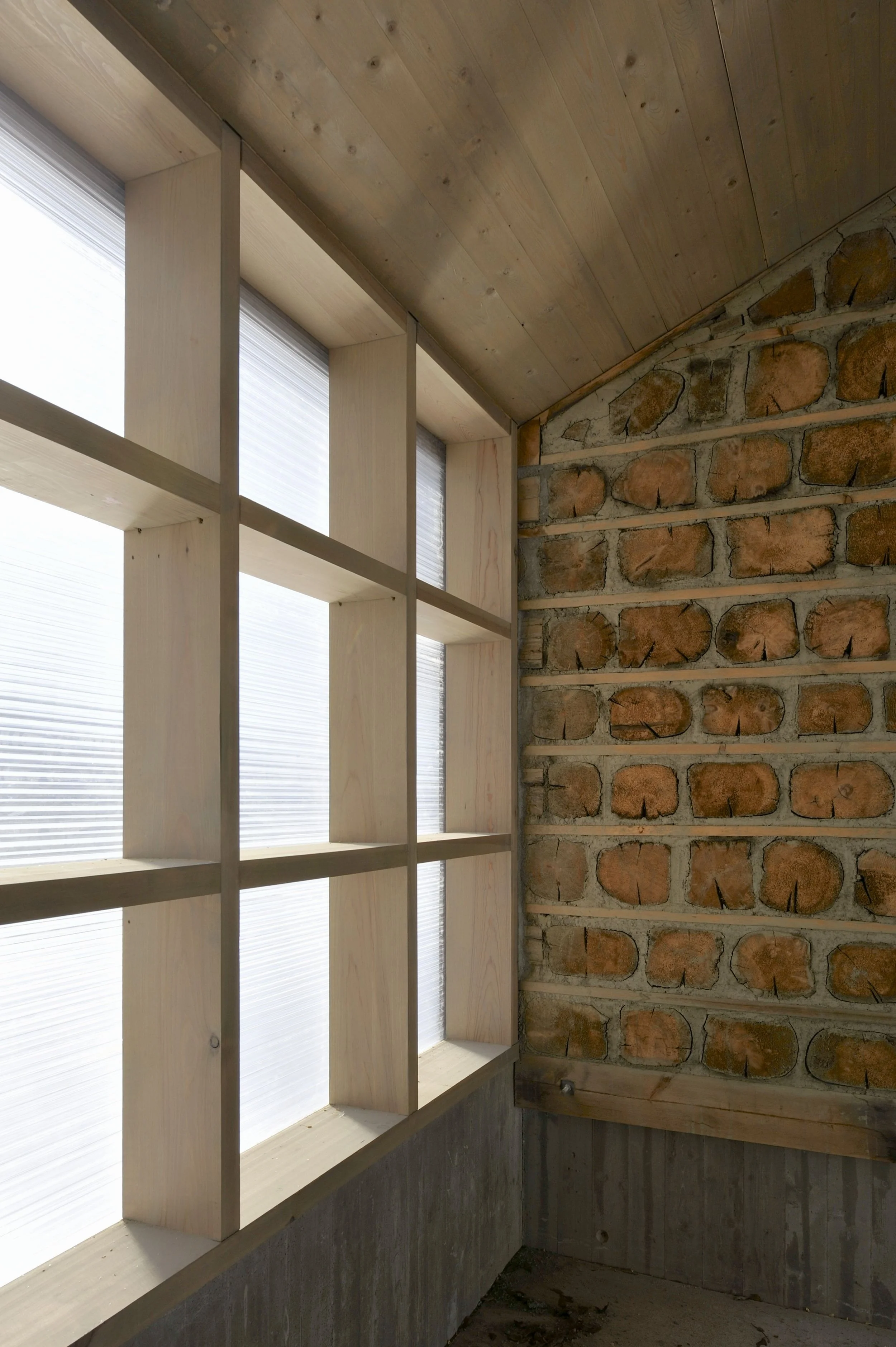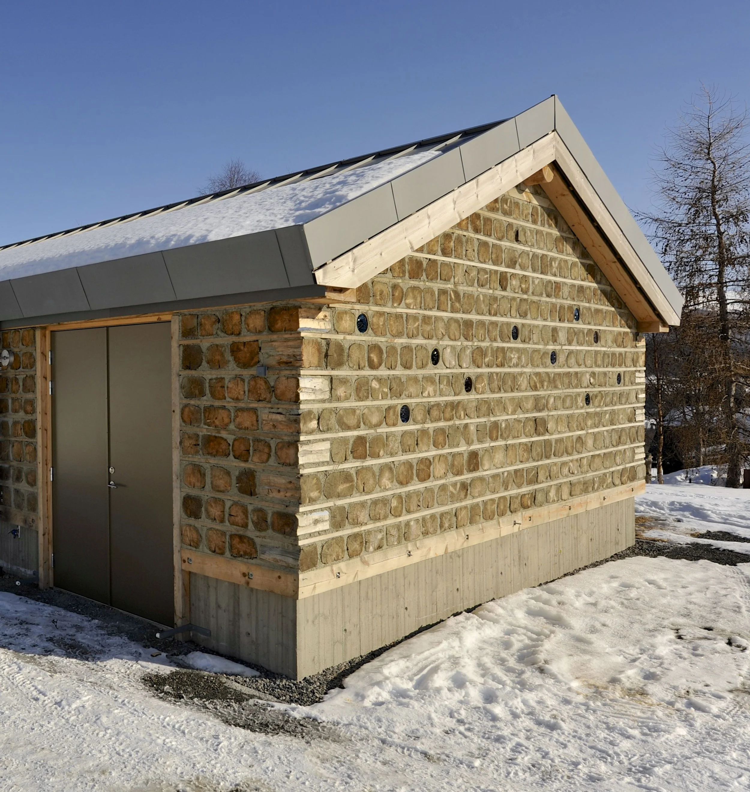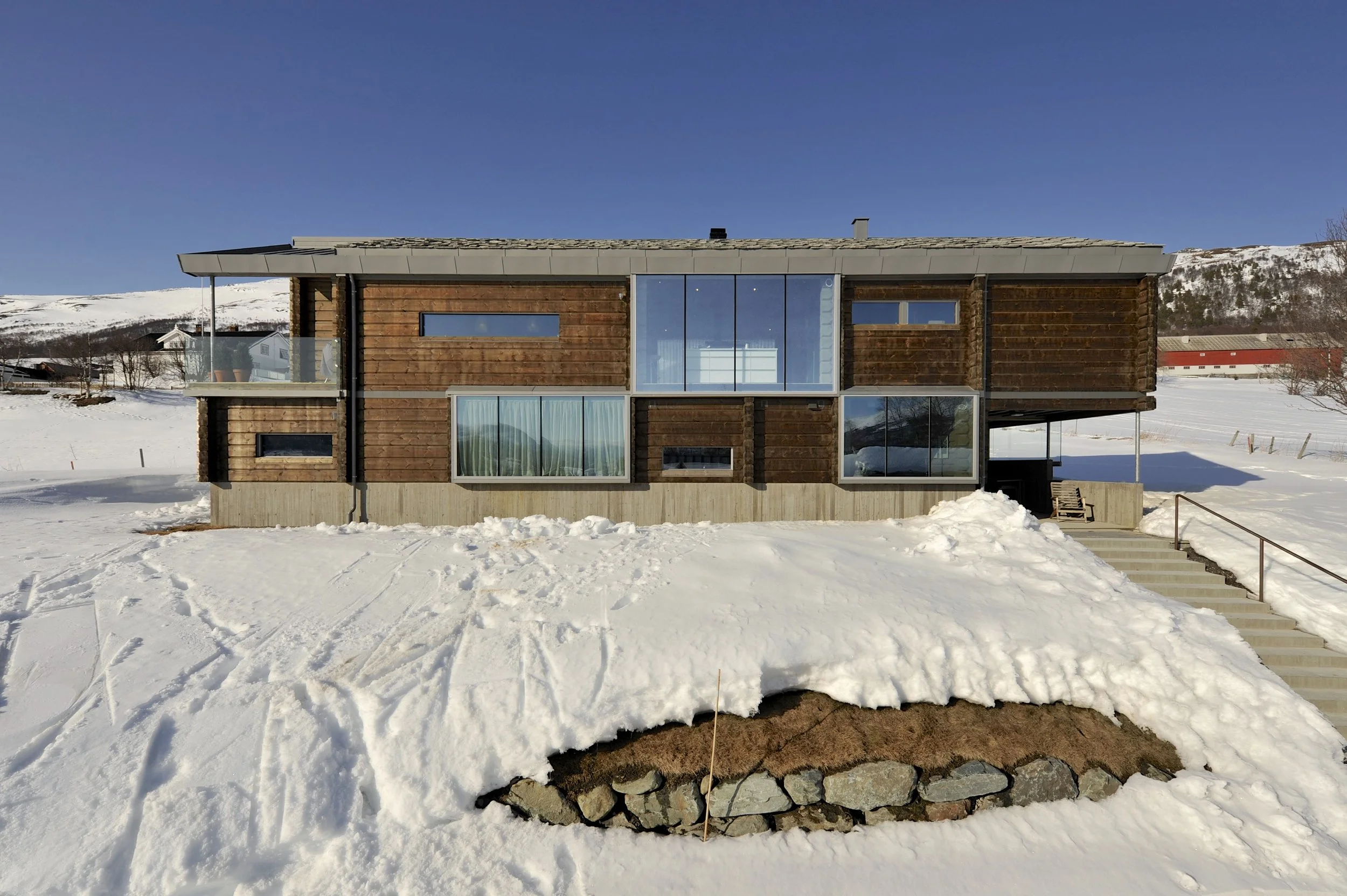 The buildings combine traditional vernacular log techniques with a modern architectonic expression. This really comes to show by using large glass surfaces mounted between the knots of the log structure. Interplay between glass-framed parts and the log structure arises – creating varied spaces.