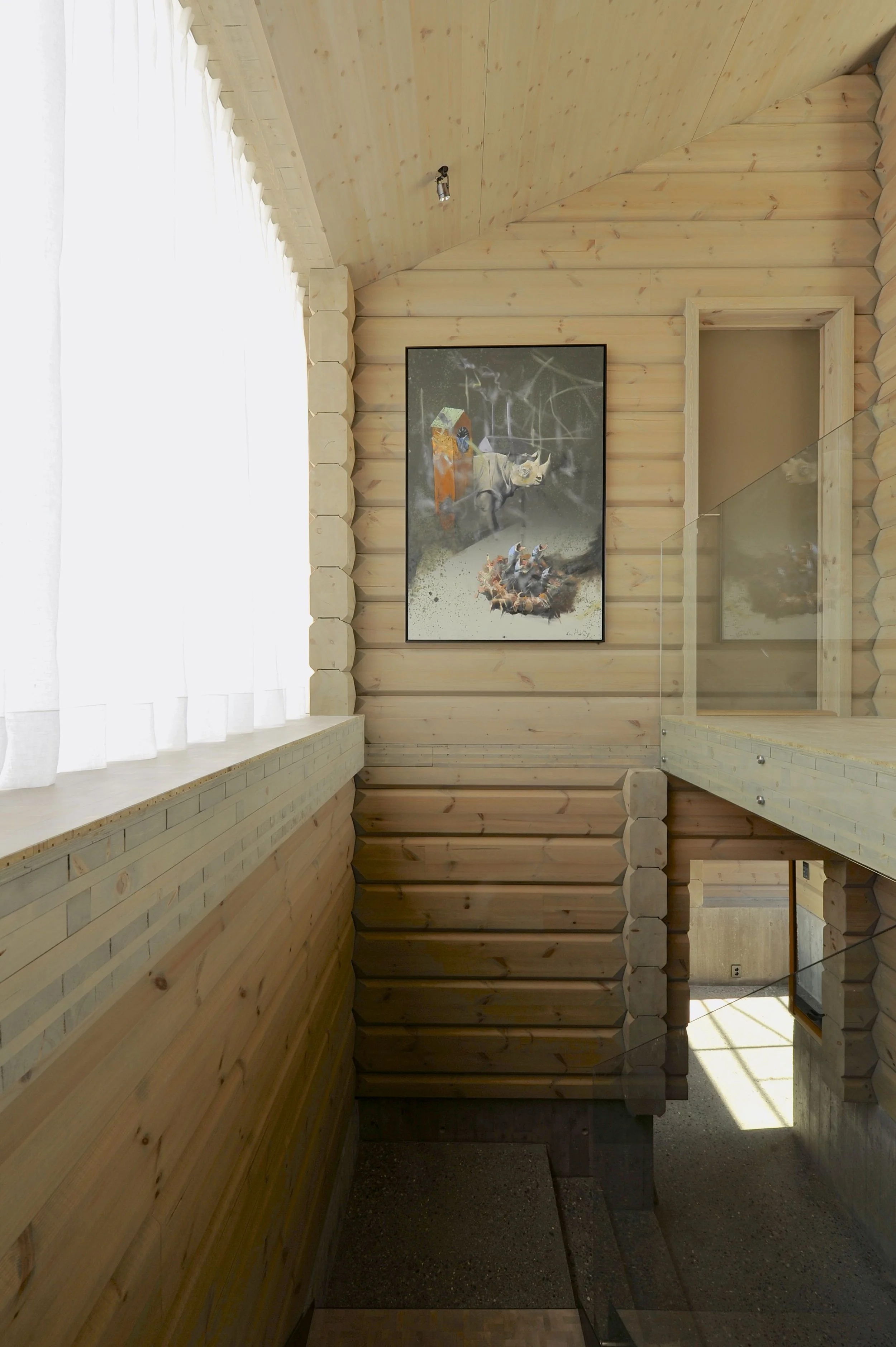 The family house is placed on the upper part of the sloped site, offering great views towards the south. An annex is placed on the lower part of the plot with a courtyard formed between the two. Both buildings are timber log structures placed on an elevated base wall of concrete. This foundation wall is elevated in order to handle the height differences in the surrounding terrain.