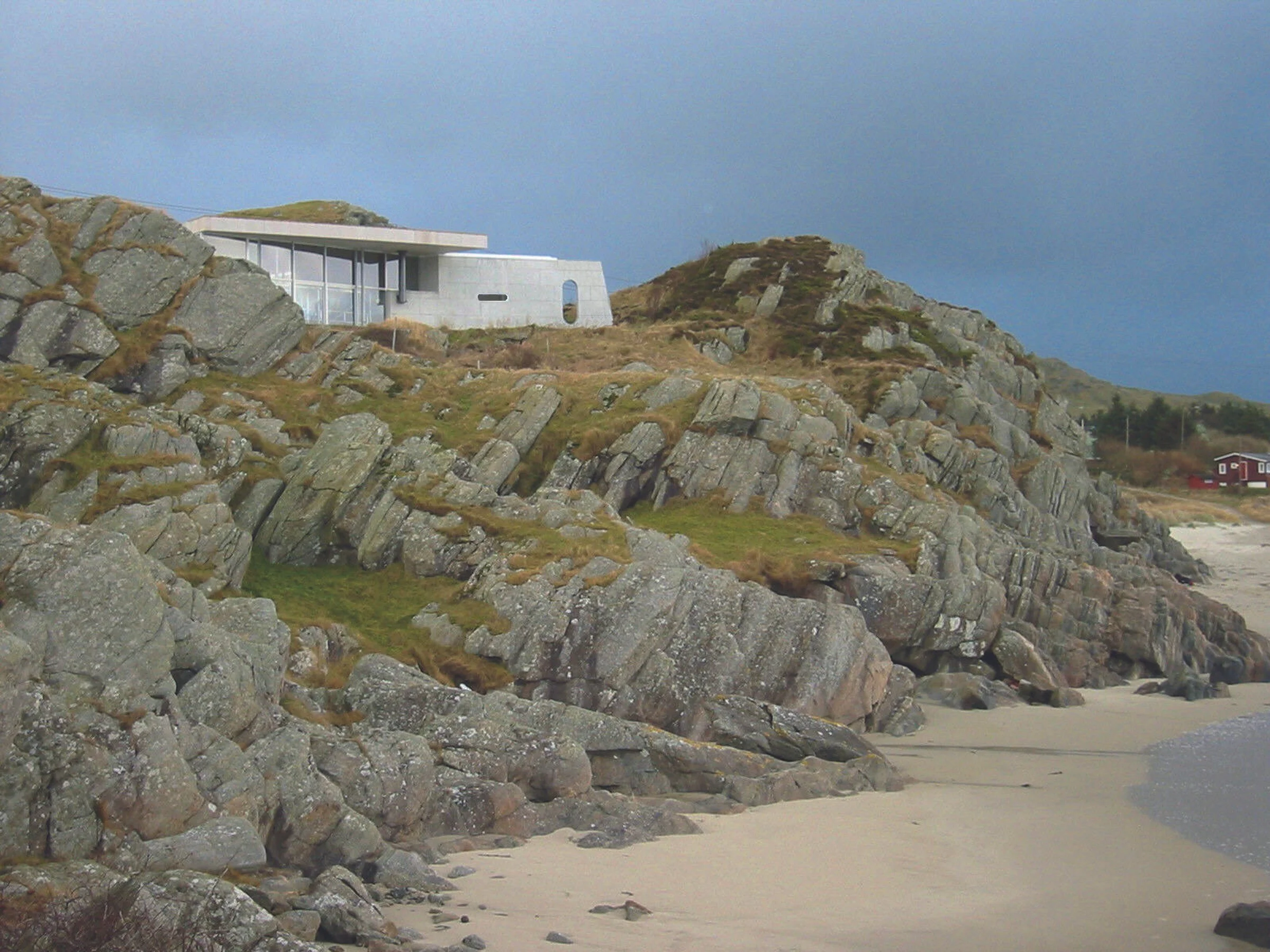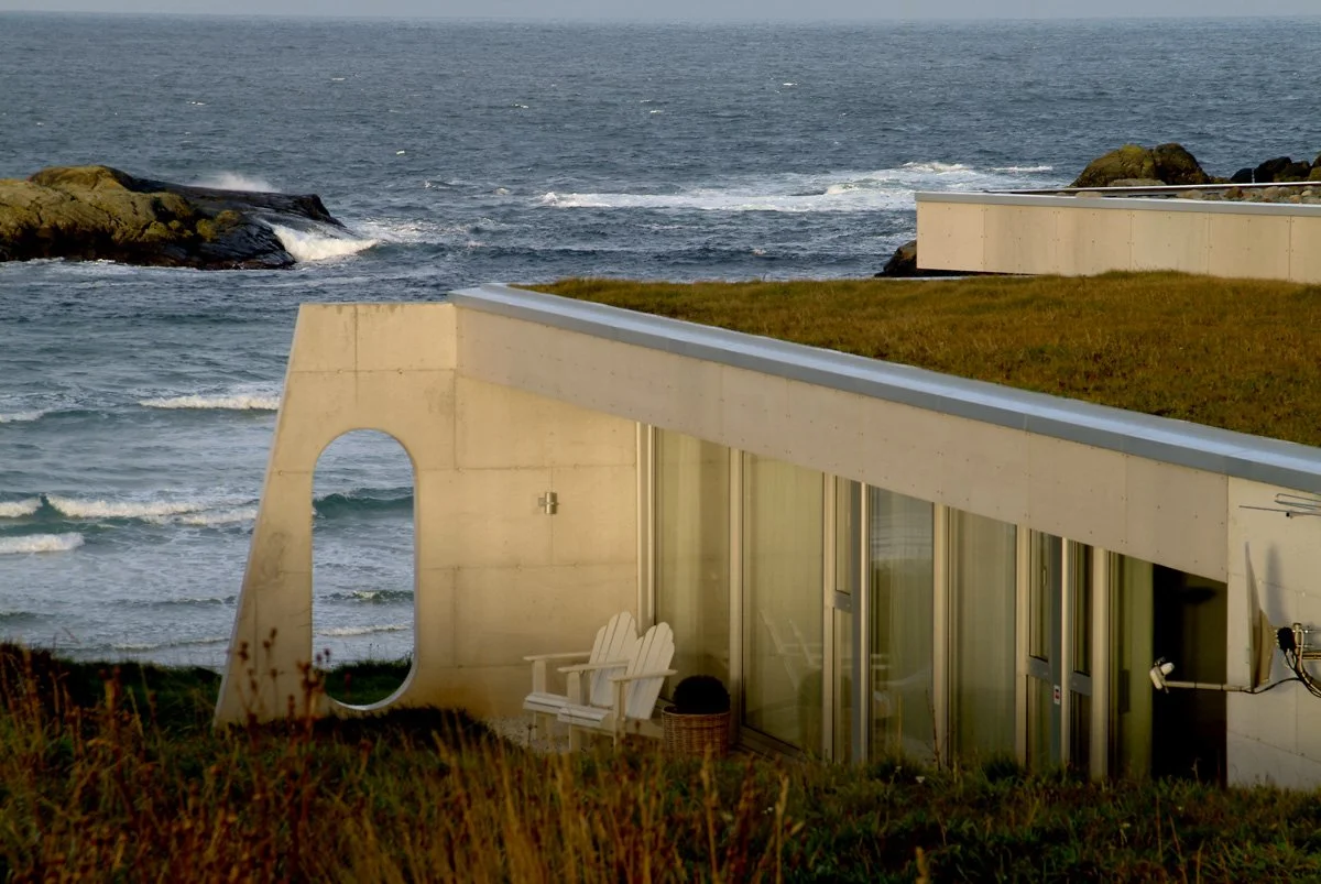 Overlooking the Atlantic Ocean this house is carved into the terrain. This allows for an unobstructed ocean view from the public road at the rear and protects the building from the strong prevailing winds. The bedrooms are organised towards naturally sheltered outdoor spaces providing close-up views, while the living room is established as a glazed amphitheatre facing the horizon. Walls are made of two-sided poured in place white concrete.