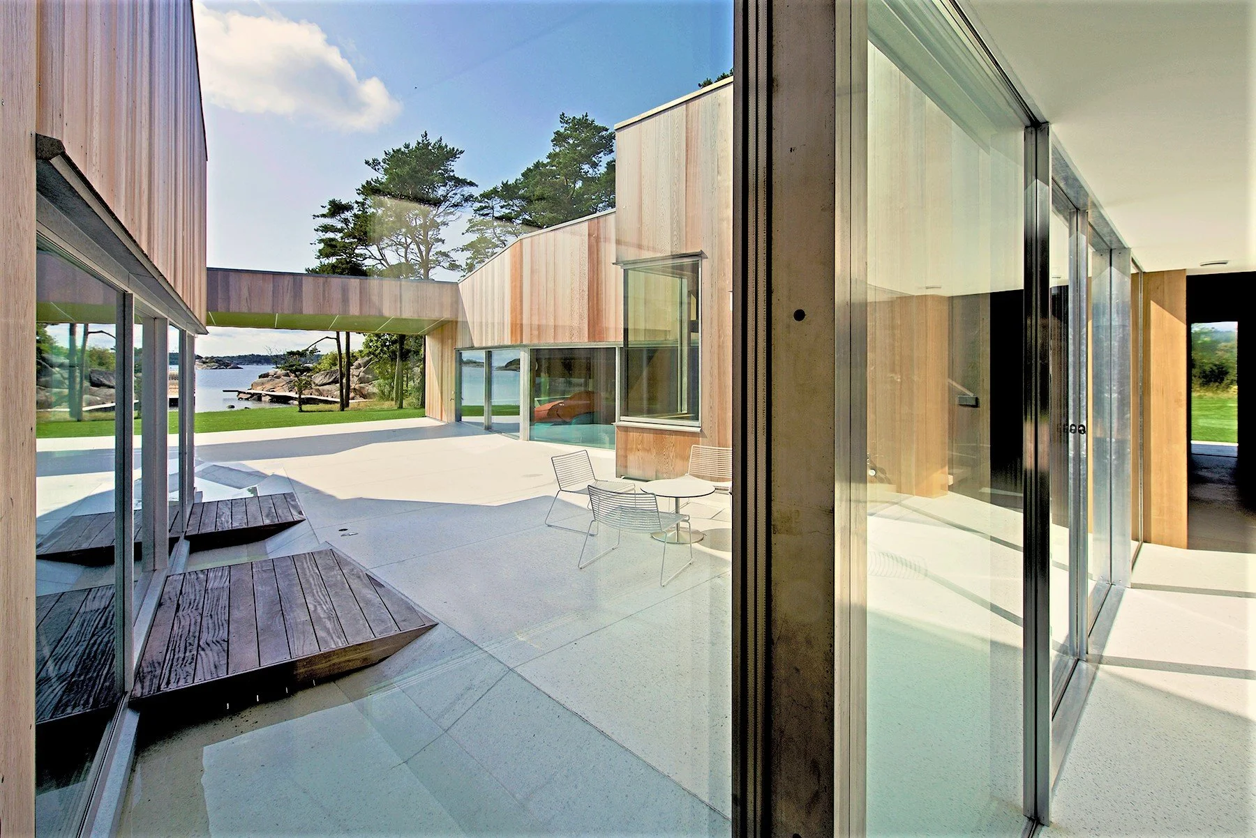 Due to public accessibility to the site the house is quite enclosed, mainly orientated around a courtyard which is shielded from wind, but still allows for views both towards the sea and the forest. The rhythm of the plan and section around this courtyard breaks down the scale of the large building volume and allows for views towards the sea from most rooms in the house. The geometry, scale and use of water within this space reflect the character of the many small clefts within the surrounding rocky and coastal landscape.