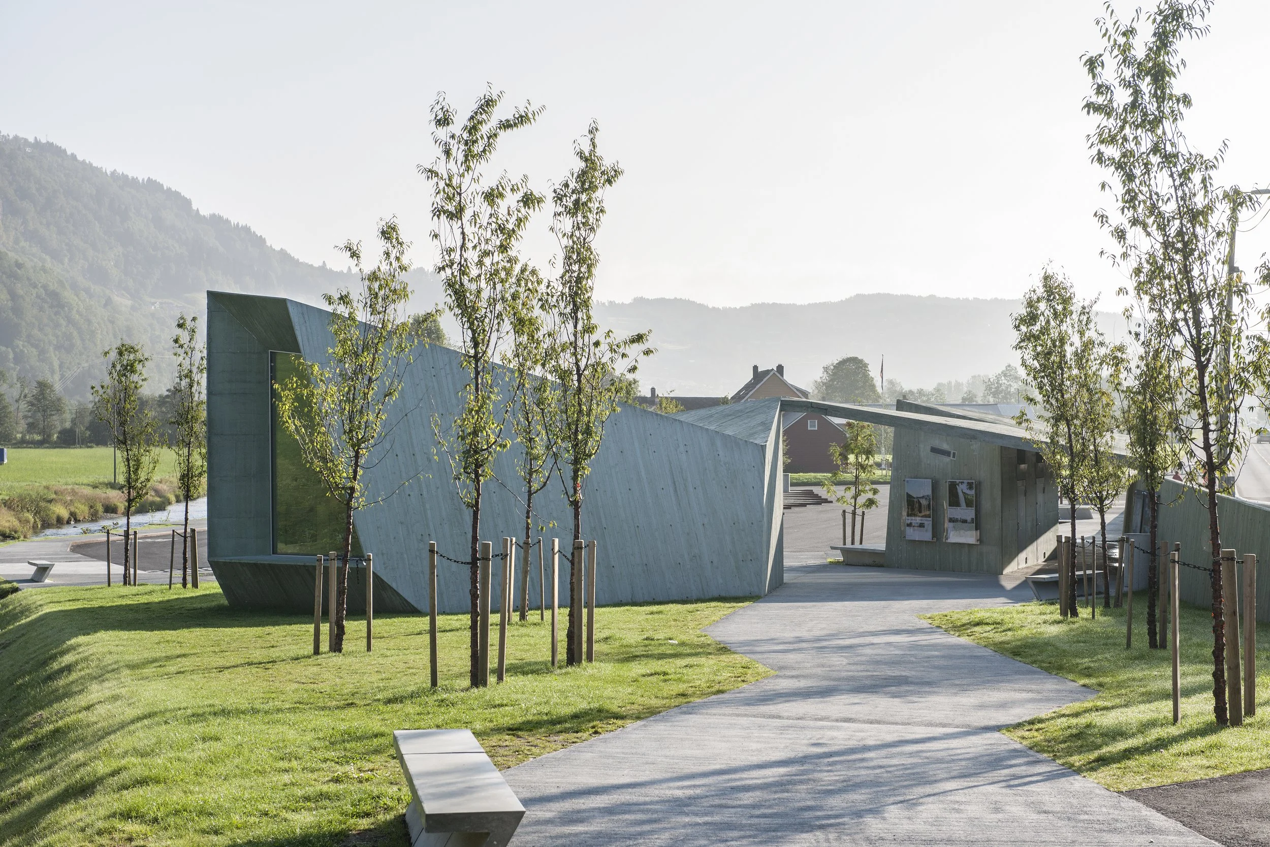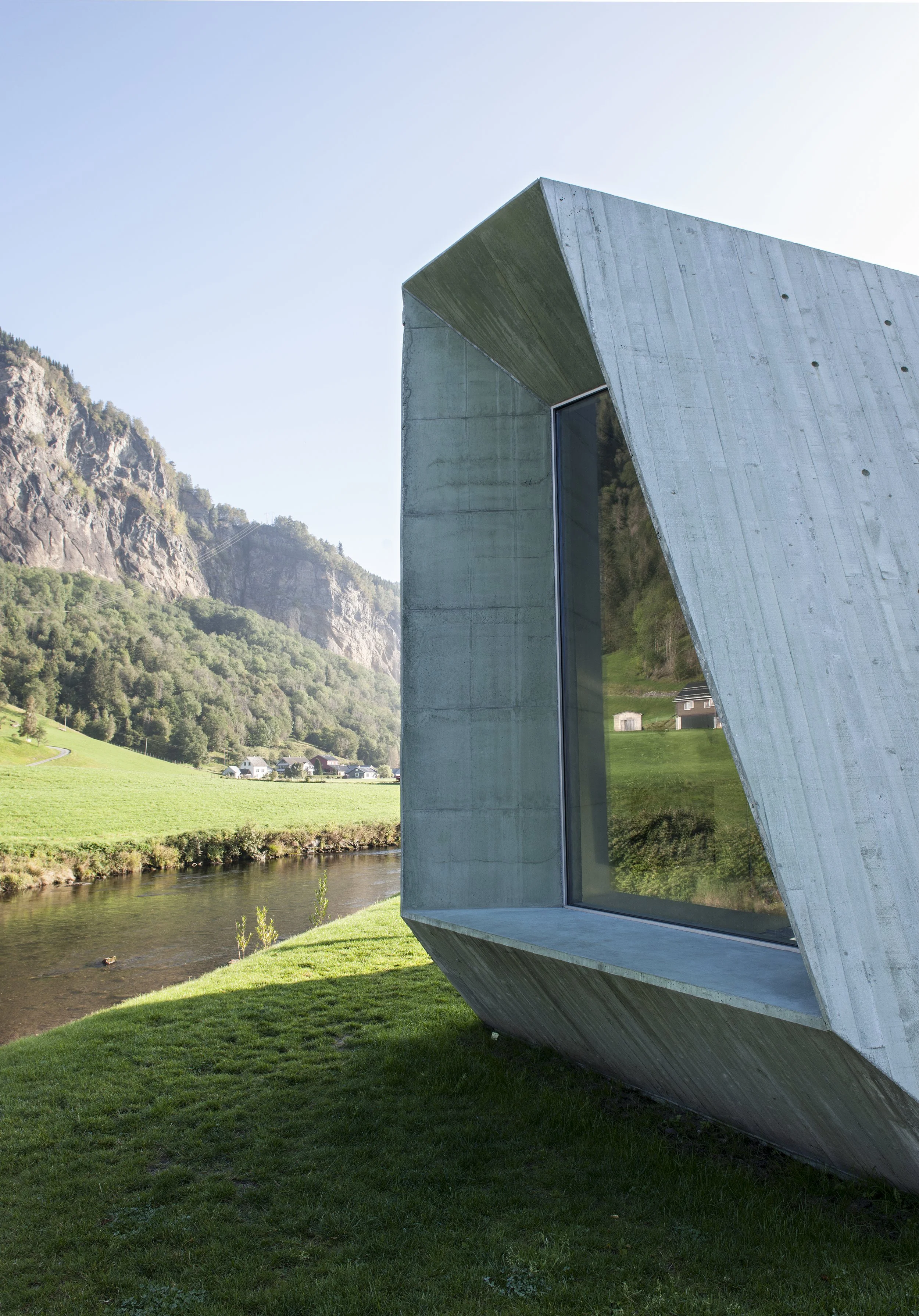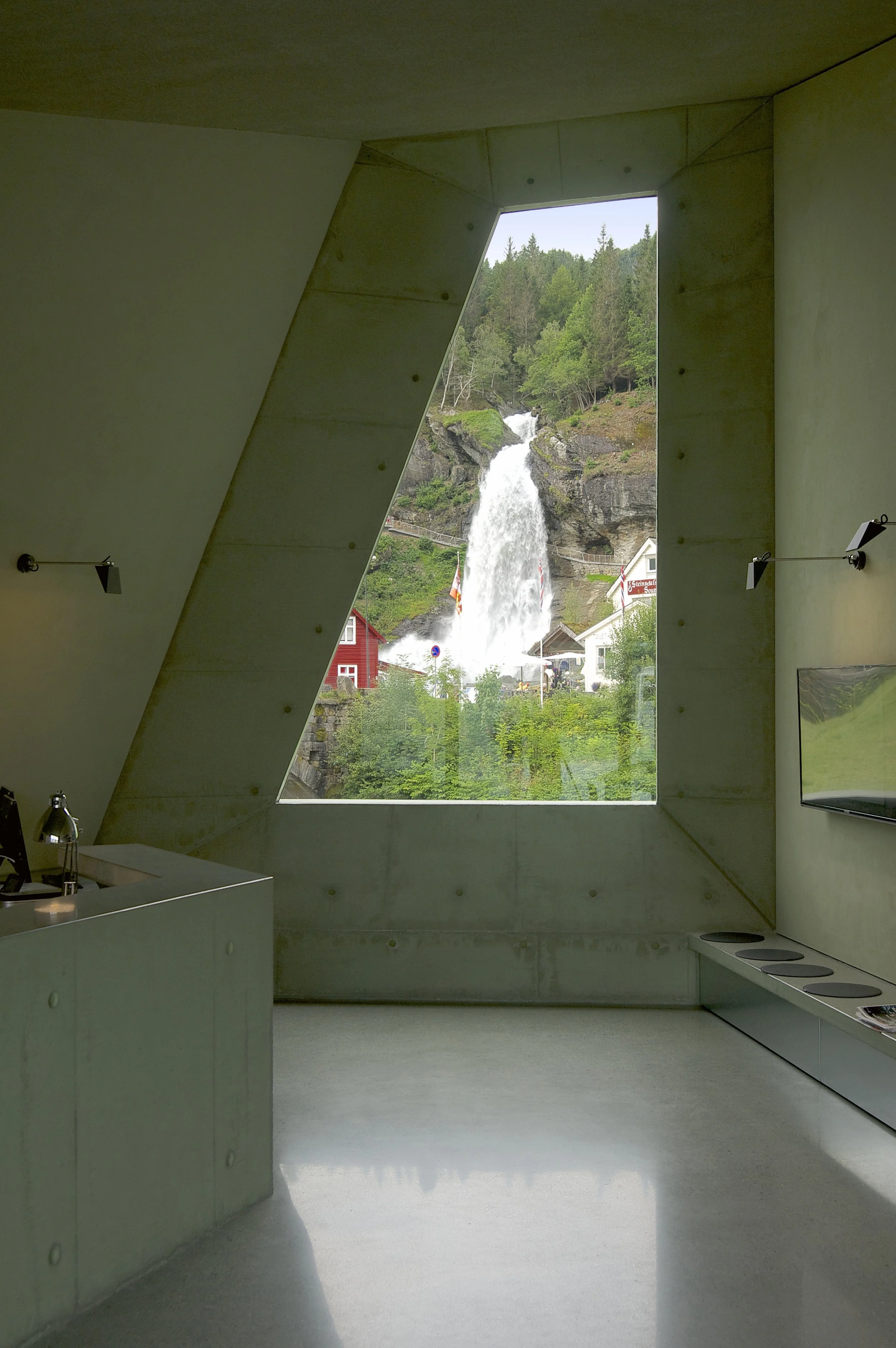 The two building volumes physically connected to the concrete wall reflects both the movement of the road and at the same time the static view of the waterfall. The project is made as in-situ concrete structures. The concrete is used as the main material, even covering the roof surface. The concrete is given a green, metallic shade to reflect the color of the river in the springtime.