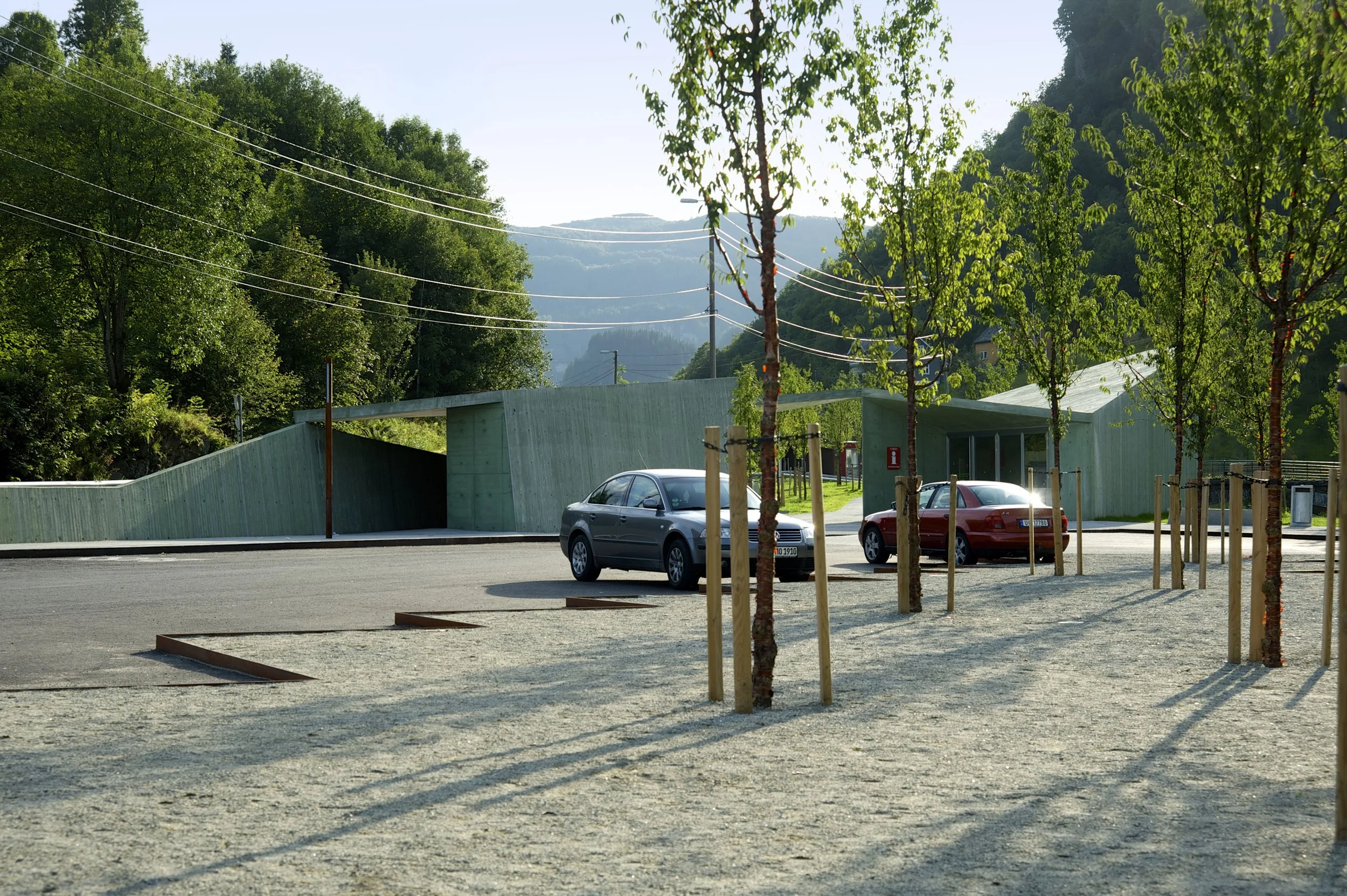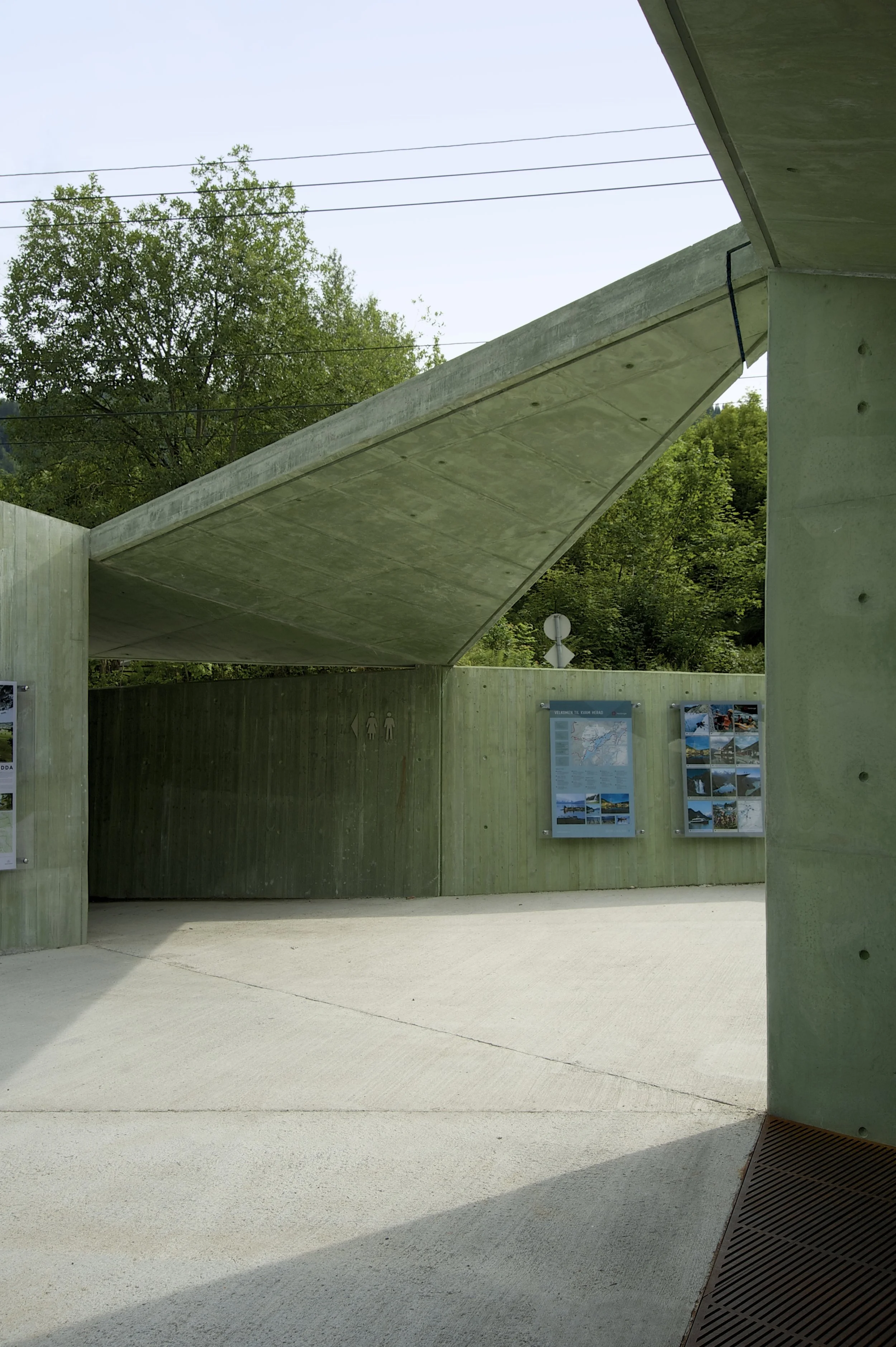 The project consists of a parking area with tourist information and a restroom facility in addition to a footpath leading to a waterfall. A concrete wall mediates the level-difference between the road and the parking surface and is the spine of the project.