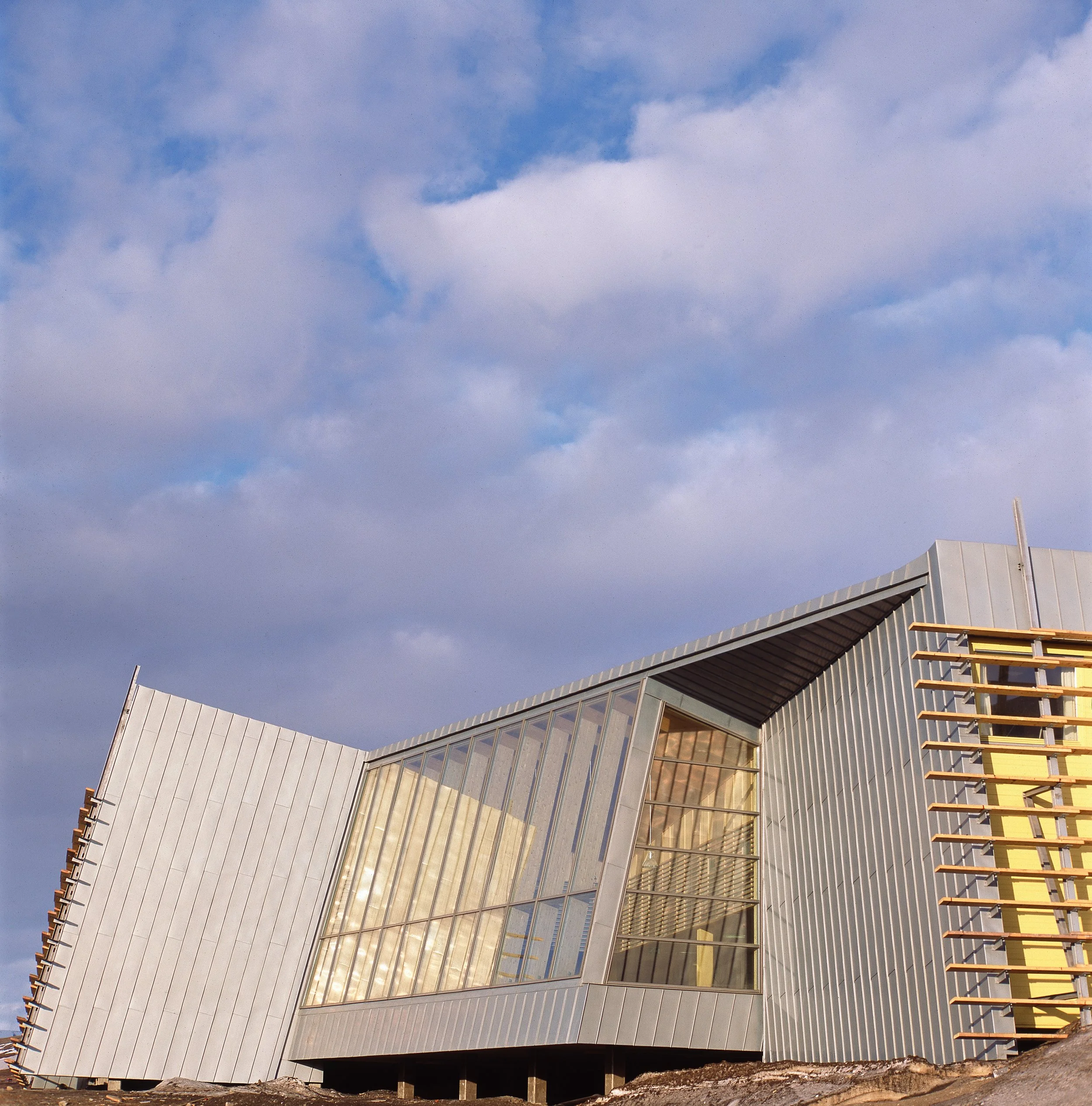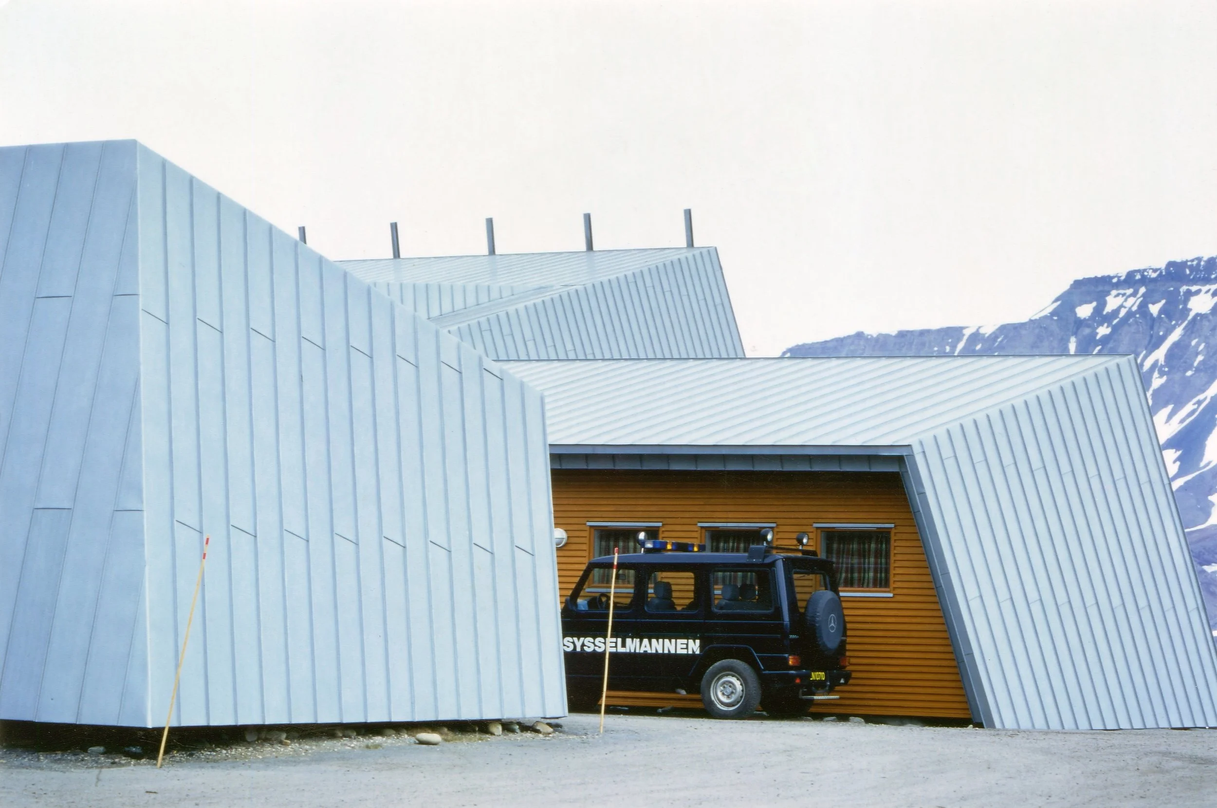 The building is sited on Spitsbergen at 78 degrees north, an was finished in January 1998. The building is a multi-purpose building which contains housing, office areas, library, garage for snow scooters, and even a prison-cell, amongst other functions. We have tried, in short, to imply both industrial building traditions (mining), and aspects of the special climatic conditions of the area in the architectural ideas of the project.
