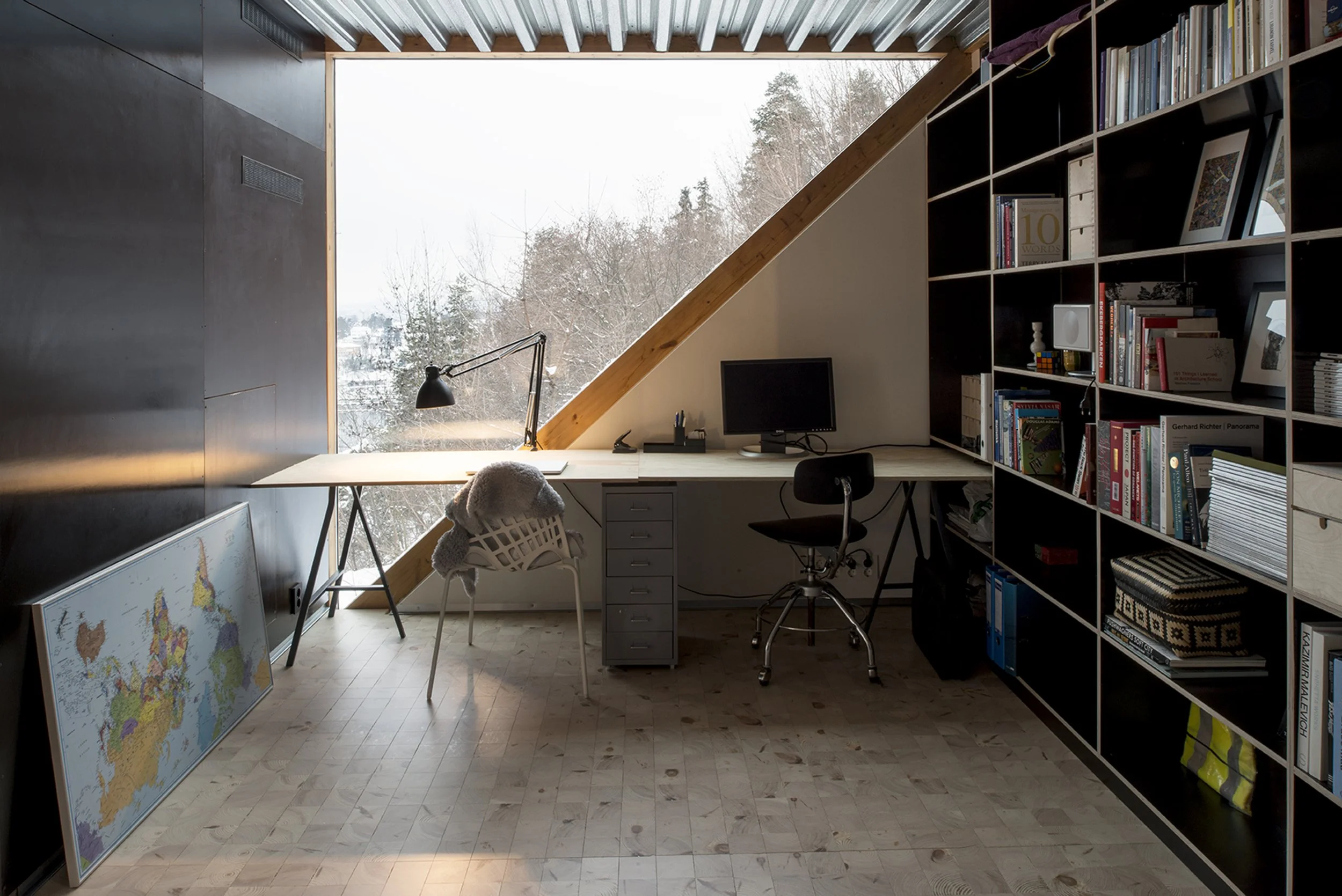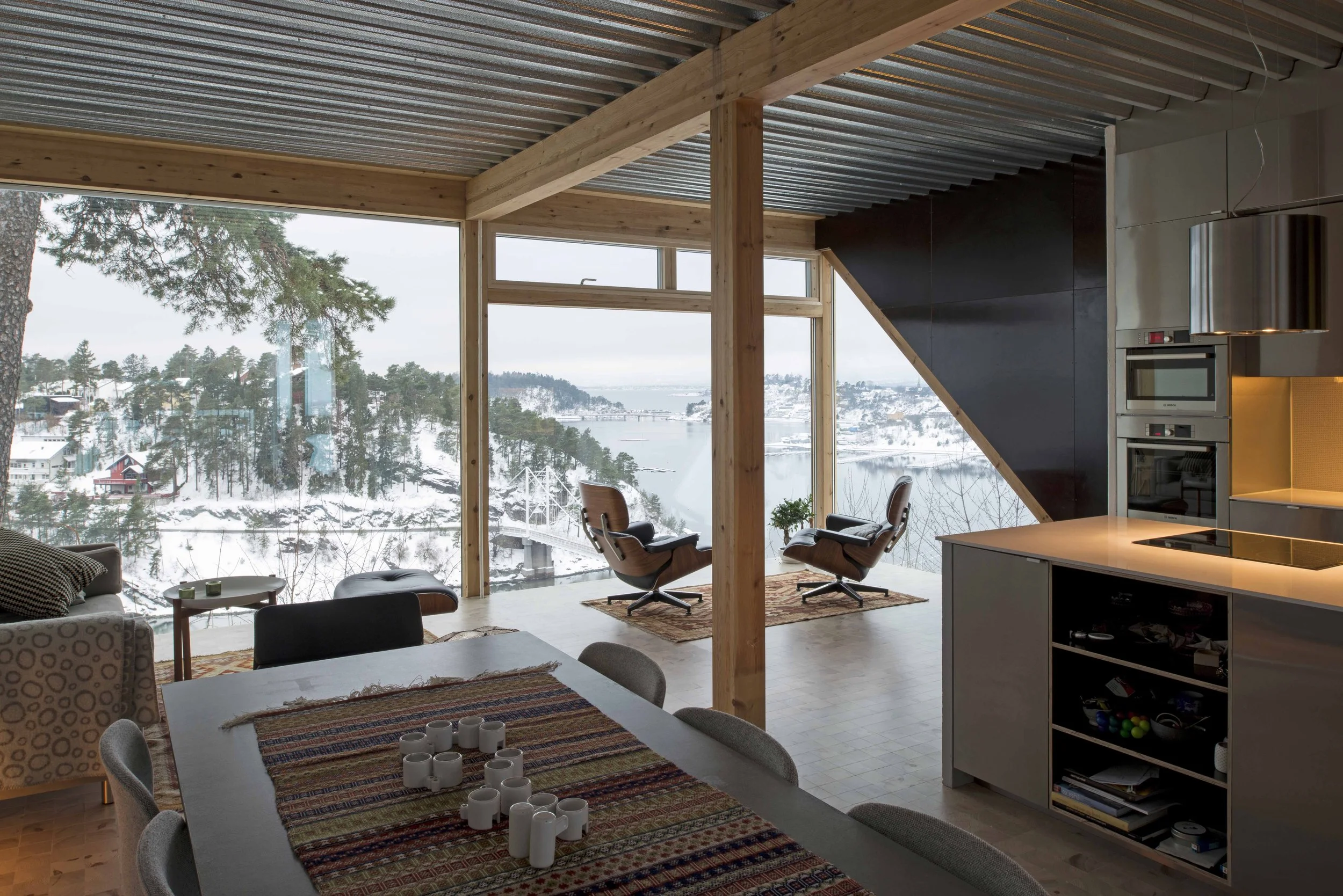 This is a house designed for two twins who want to live next to each other. The house is situated in a residential area of Oslo. The site was earlier a part of an old fruit garden located in a steep slope, with a spectacular view over the Oslo fjord.