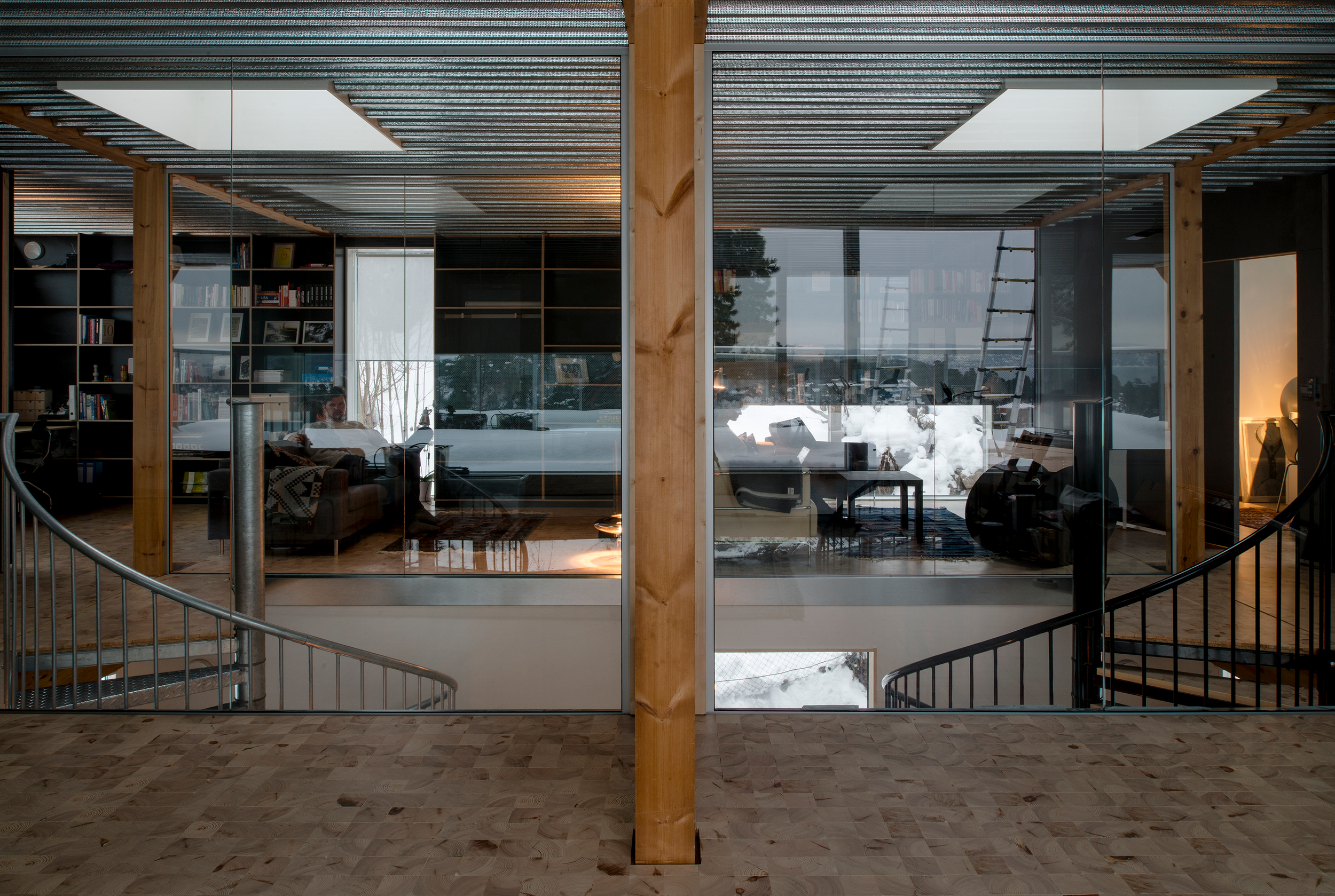 The building divides the site into two levels, with cantilevers framing the entrance in the back and sheltering a terrace in the front. The structure is a modular timber frame system that allows maximum flexibility concerning the twins’ respective living situations over time. The timber frame is fixed onto a concrete slab foundation, and merges with decks of visible corrugated galvanized steel. The exposed and raw use of materials give the interiors an industrial look which responds to the modular system.